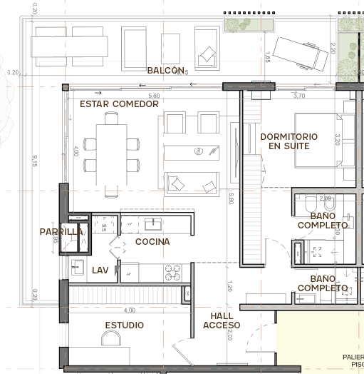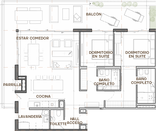 Galería de arte | Estar comedor | Cocina | Lavandería + Despensa | 2 Baños completos | Dormitorio en suite | Estudio | Parrilla | Balcón 78m2 cubiertos | 34m2 de balcón 112m2 superficie total